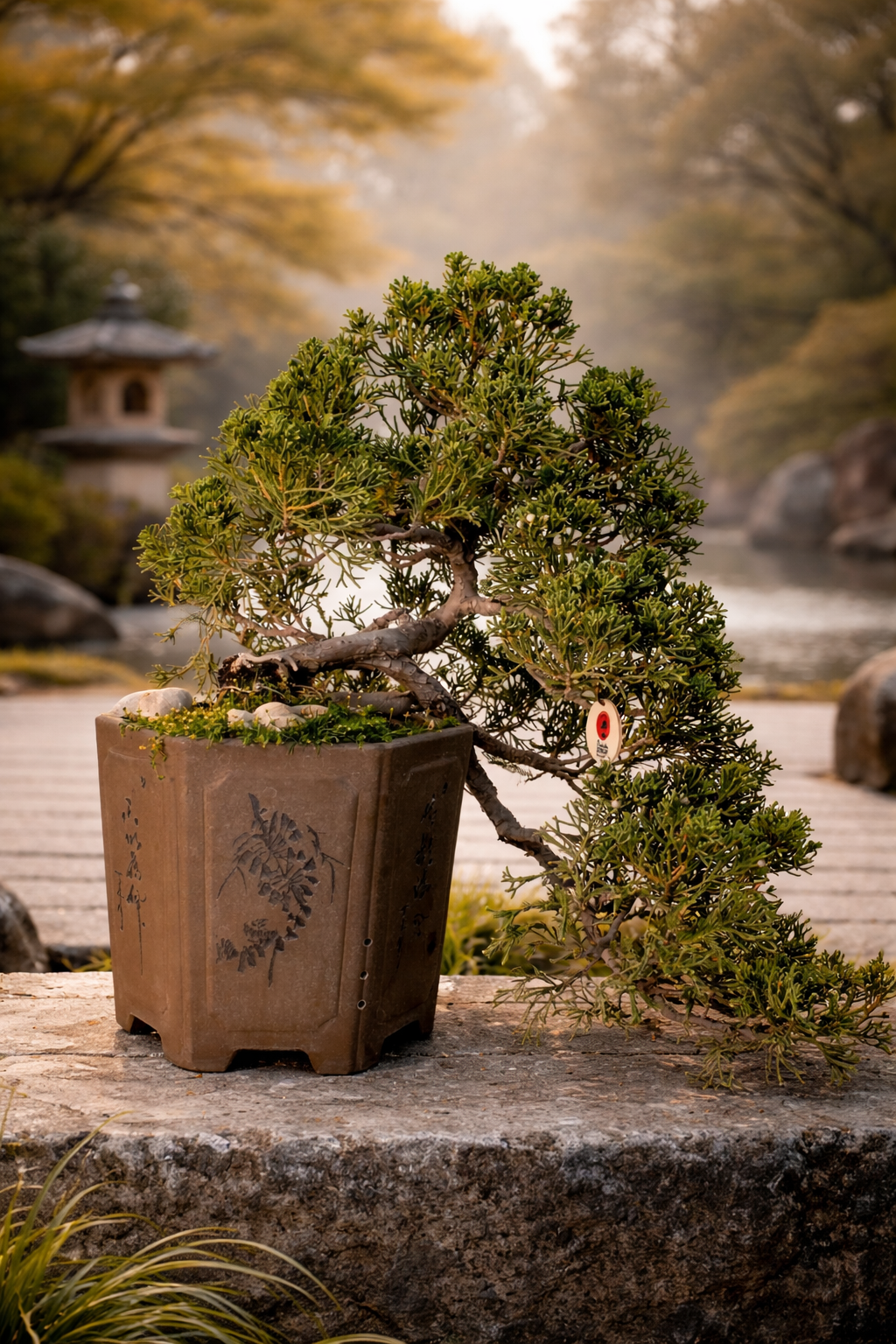 Nota: Maceta importada de Yixing, sin esmaltar, de textura cerámica natural. Respeta la estética austera de la Sabina y favorece una óptima respiración radicular.