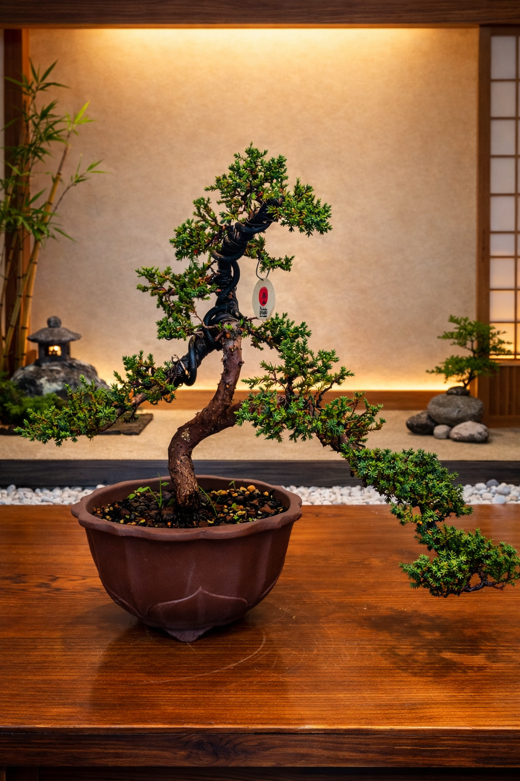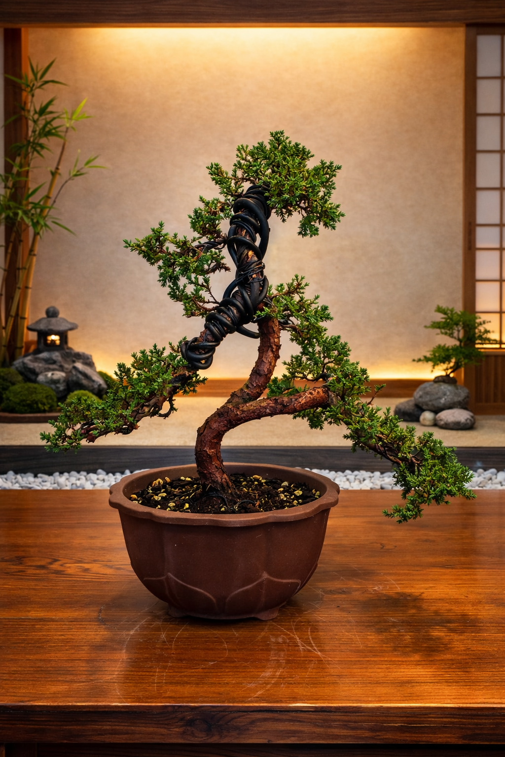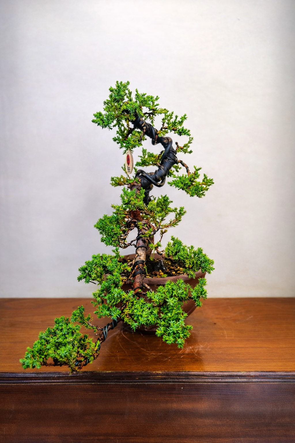 El Juniperus procumbens ‘Nana’ en estilo semicascada es una composición que combina dinamismo y equilibrio, donde la línea descendente del tronco genera tensión visual sin llegar a la vertical extrema de una cascada completa. Esta variedad japonesa rastrera es ideal para este estilo gracias a su flexibilidad y vigor controlado.